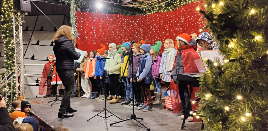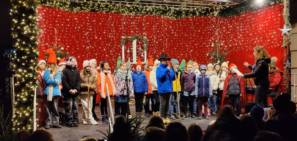 Durlach, 15. Dezember 2025 – Auf dem Durlacher mittelalterlichen Weihnachtsmarkt herrschte am Montagnachmittag eine ganz besondere Atmosphäre, als 29 Schülerinnen und Schüler des Chores der 4. Klassenstufe der Schloss-Schule Durlach die Bühne vor dem Karlsburg-Portal betraten.